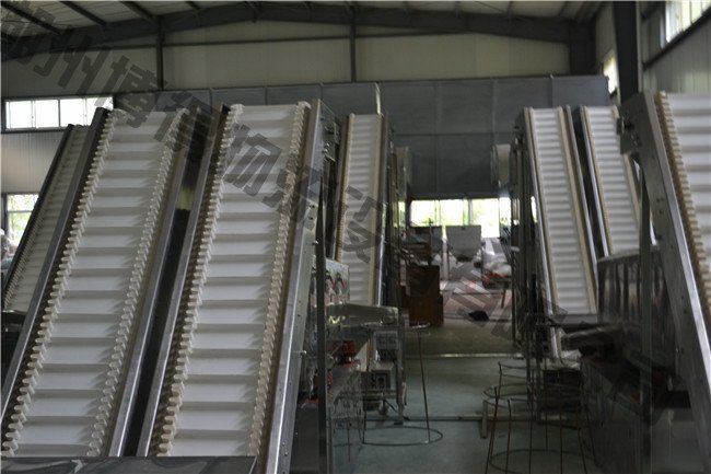 爬坡皮帶機是爬坡皮帶輸送機的簡稱,是皮帶輸送機的一種。爬坡皮帶輸送機運用輸送帶的連續(xù)或間歇運動輸送500kg以下的物品或粉狀、顆裝物品。爬坡式皮帶輸送機運用于有高低差的輸送情況下,可完成連續(xù)輸送,能平滑的與滾筒輸送機或鏈板輸送機接駁。 爬坡皮帶機輸送帶的材質(zhì)有:帆布帶(或尼龍帶)、塑膠帶、防靜電PVC帶、橡膠帶(重的物體采用帶鋼絲的橡膠帶)、金屬網(wǎng)帶等。爬坡皮帶機輸送的角度*好不要超過13度,如果超過13度要在皮帶表面增加擋條或者皮帶要選擇帶有摩擦的草帶。在制作爬坡皮帶機時通常要在皮帶機兩側(cè)腰邊增加防護欄或在皮帶的側(cè)邊增加裾邊,以防止物體在輸送過程中跌落。